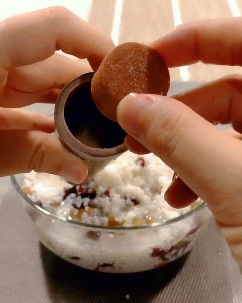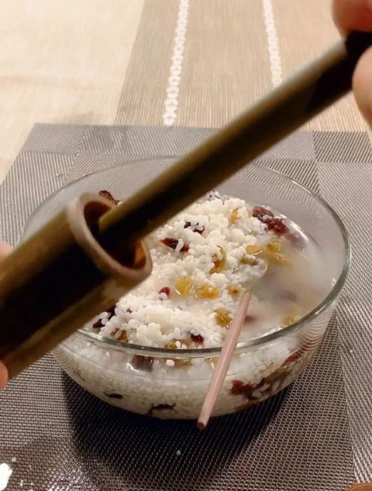 2、邊灌米一邊用筷子捅一捅,為的是米粒之間更緊實。