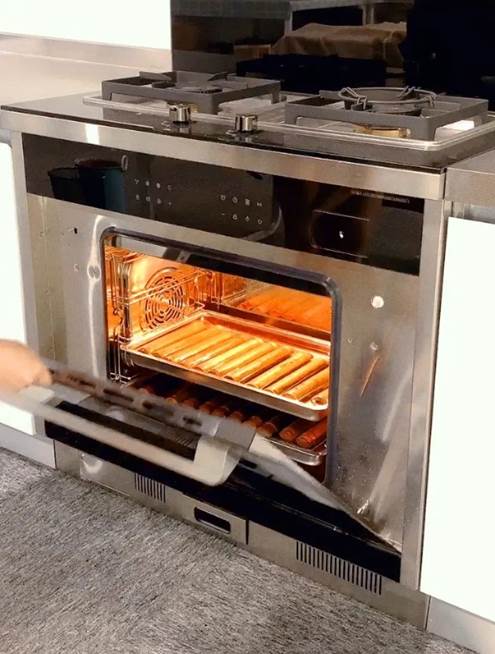 6、做好的竹筒粽子放入森歌集成灶蒸烤一體機中,加水沒過竹筒粽子。一定要沒過粽子,不然漏在水外邊的粽子很難熟的。