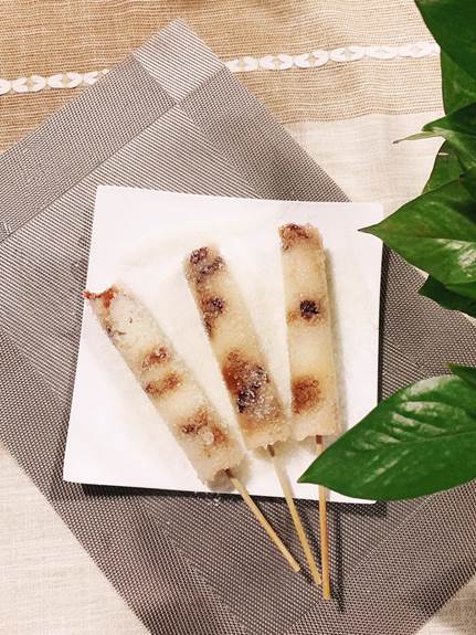 8、先打開一個看看成果。取出的竹筒粽子放入涼水中泡幾分鐘,用竹棍從竹筒底部推出來,不松不散,又軟又糯!推出來后裹上層白糖更好吃~~